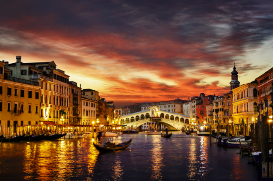 威尼斯是意大利东北部城市,亚得里亚海威尼斯湾西北岸重要的港口,有“水上都市”、“百岛城”、“亚得里亚海的女王”、“桥城”和“水城”的美称。威尼斯因水而生、因水而美、因水而兴。这里有浴火重生的凤凰歌剧院、文艺复兴式和拜占庭式的独特建筑、被拿破仑誉为“欧洲最美丽的客厅”的圣马可广场、美得令人窒息的回廊。不过威尼斯的水平面每年都在不断上升。科学家预言:不久的将来,这座美丽的水上都市将被完全淹没。因此,想一睹其浪漫风采的人可要抓紧时间哦。
